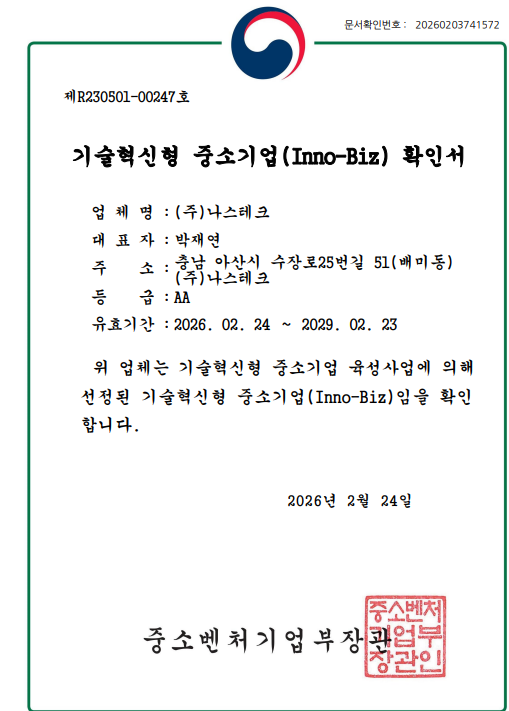 상호 : (주)나스테크 대표 : 박재연 본사 : 충청남도 아산시 수장로25번길 51(배미동 145-3) 사업자등록번호 : 312-81-04951